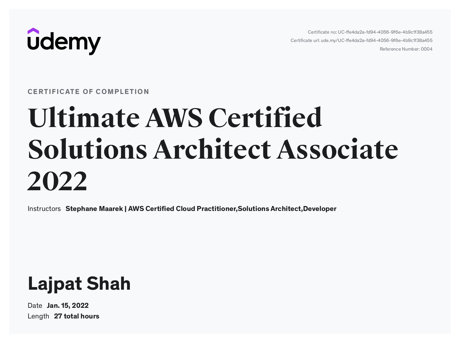 Received completion certificate from Udemy for finishing the course on AWS Solutions Architect Associate.